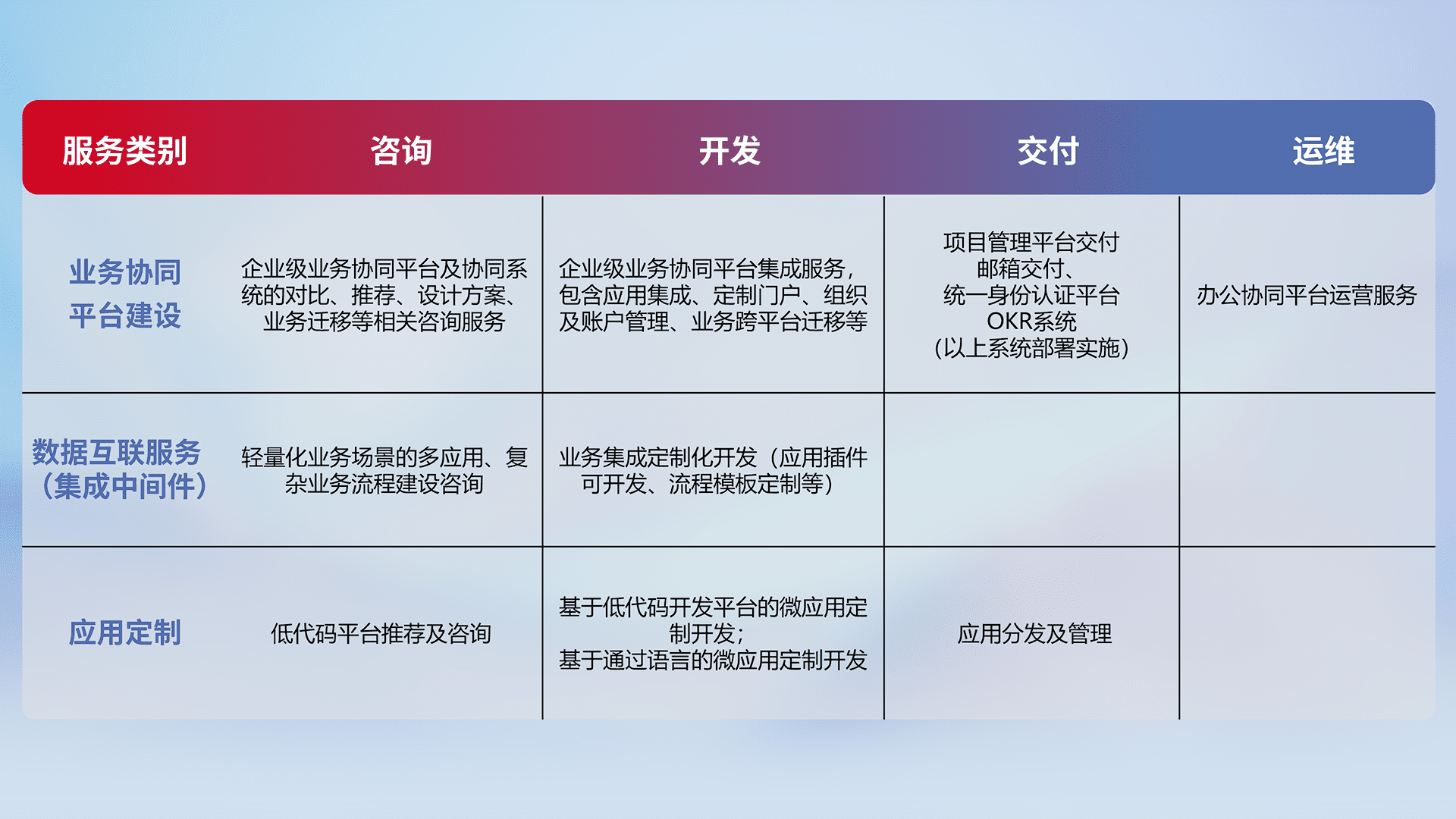 针对钉钉、、、企微、、、、IDaas等平台级产品提供产品的规划、、方案、、交付、、、、定制化开发等服务,,,,实现如统一协同办公、、、智能客户服务、、混合会议管理、、智能数据查询、、、、等业务场景,,实现数字化转型。。