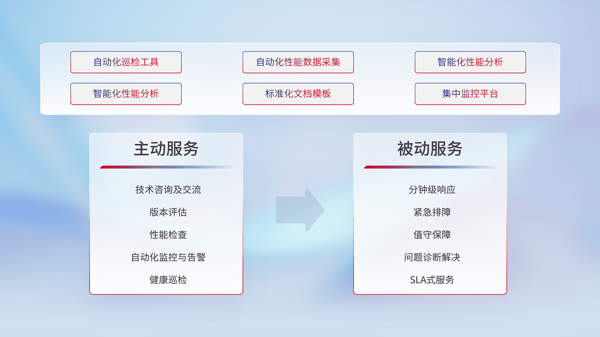 智能化工具和标准化文档,,,保障服务质量,,提供主动服务(包含技术咨询、、版本评估、、、、性能检查、、、、自动化监控与告警、、健康巡检)和被动服务包含(分钟级响应、、、、紧急排障、、、值守保障、、、问题诊断解决、、SLA服务)。。。。
